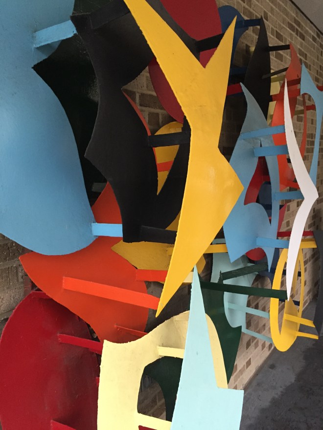 Structured bars of wielded bronze come together to form the synchronicity and convergence of three rivers. The bolts holding the moment together resemble rocks in the river, that are the river also, tumbling and shaping the water. I see a shadow of a boat or ship in the form that reminds us of the human ingenuity that has allowed us to travel on water. The sculpture, while abstract in form, carries the undulating sensation of a set of rivers converging.
