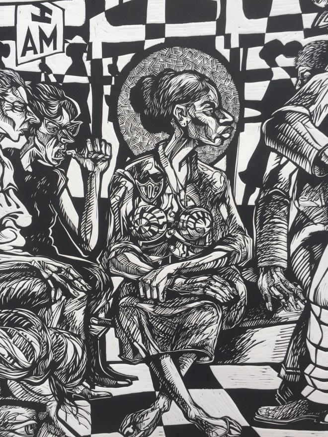 Prince was commissioned by Segura Art Studio at The Notre Dame Center for Arts and Culture to create a linocut print over the course of 10 days in South Bend. His piece “Rosa Sparks” depicts a representation of the bus scene that occurred in Montgomery, Alabama when Rosa Parks refused to give up her seat, setting off a chain reaction of civil rights battles and victories across the country. He included religious imagery throughout his piece and small homages to Notre Dame can be found throughout the piece, such as the halo that surrounds Rosa Parks which matches the halo on Touchdown Jesus. In the far left corner a young black woman represents the Madonna with baby Jesus sitting on the back of the bus carrying a look of uncertainty and fear on her face. Next to her is a representation of Treyvon Martin who stands defiantly with MLK and Malcolm X in his shadows. The representation of the average black male with a double edge sword for a tie and standing in the “hands up, don’t shoot” position starkly contrasts the apathetic stance of the white bus driver. Outside the bus are protesters whose signs and movement penetrate the bus and create a cohesion of events, showing the fluidity of the civil rights movement.
